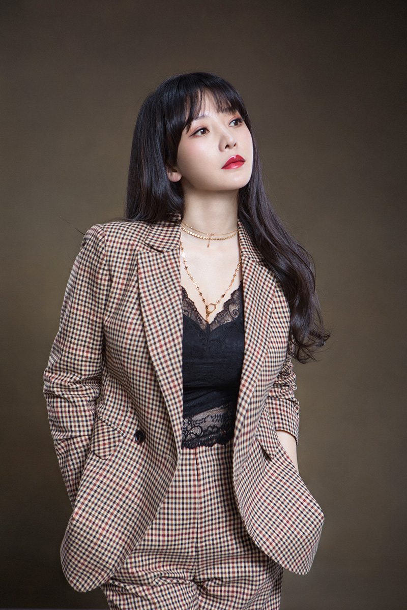 外搭的西装采用格纹的复古色彩,多了几分文艺风格的味道,搭配黑色的短款V领蕾丝,形成外长内短的搭配,而且精致的项链和珍珠颈圈为搭配加分不少,更显奢华和迷人。