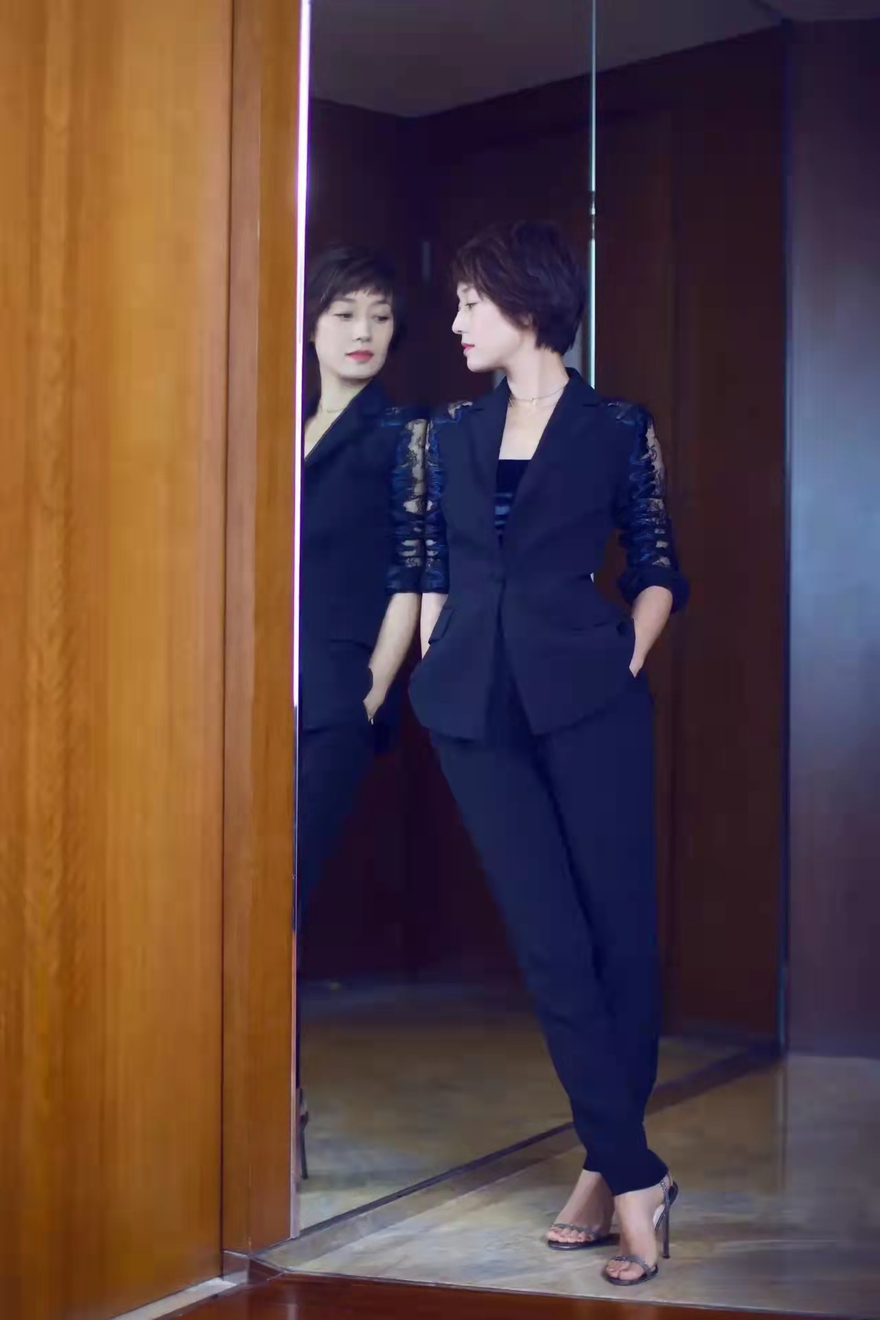 小面积的蕾丝点缀,可以增添搭配的活力,即使没有过多的修饰,也可以让西装表现出她独特的魅力和风格。