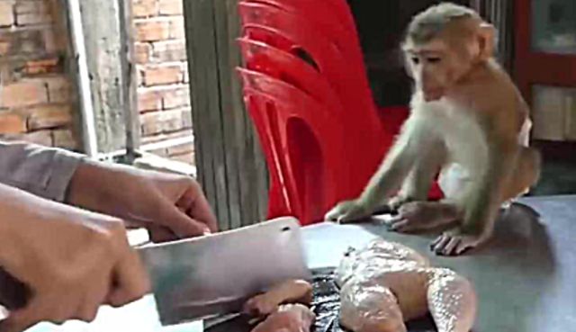 于是女子便开始吸引小猴子的注意,一刀刀的便开始剁起鸡肉,而小猴子见到这一幕显然是接受不了,它随着女子剁鸡肉的韵律哆嗦着,女子刚好停下来,它便立马跑到女子身边拉住她,女子并没有因此停下手中的动作。